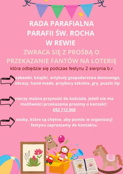 Z okazji XX-lecia Parafii Świętego Rocha w Rewie, wzorem ubiegłych lat organizujemy wielką loterię fantową, która zawsze cieszy się niezwykłą popularnością.